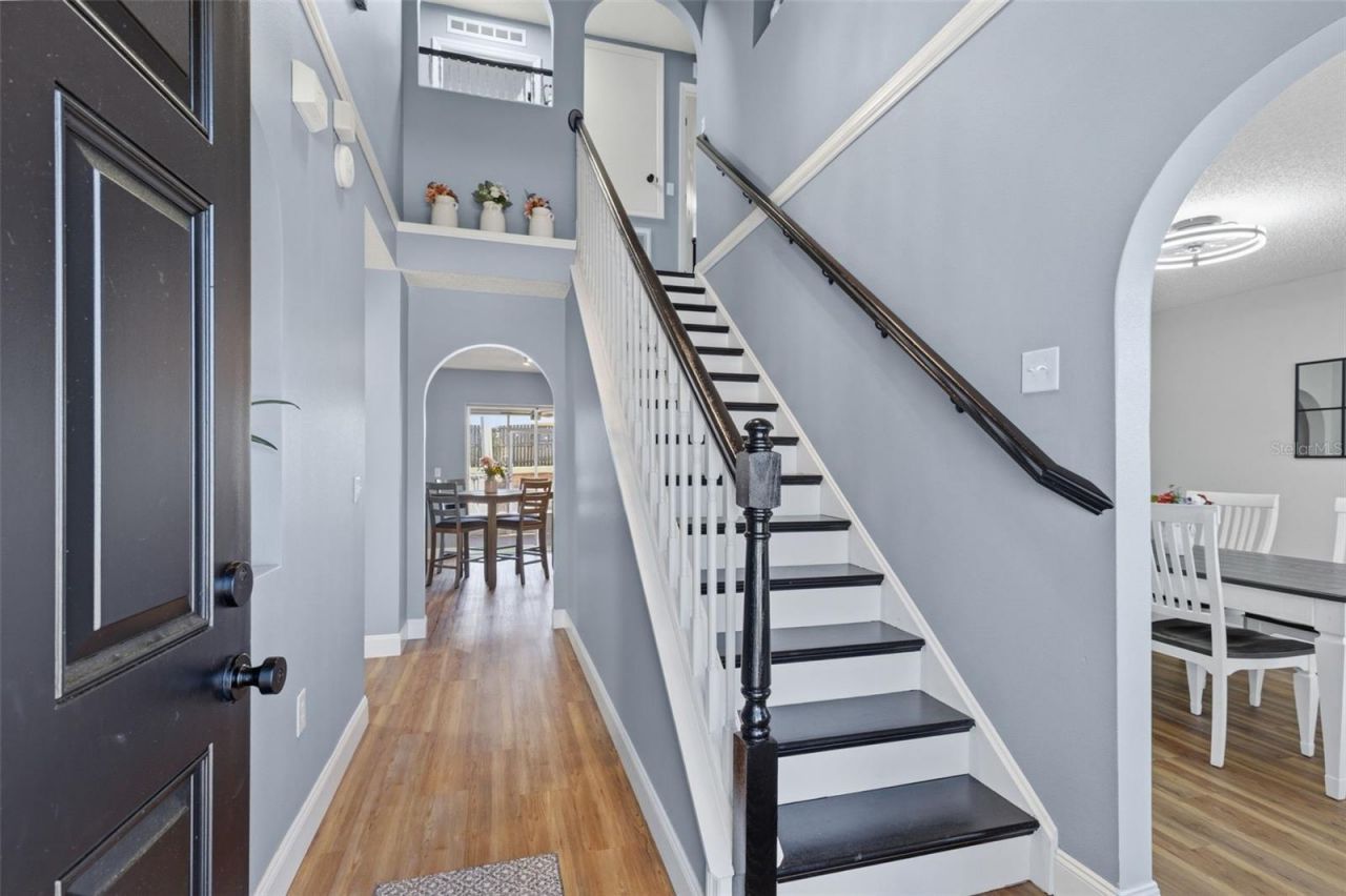 Welcome to this beautifully maintained 4-bedroom, 2.5-bath, two-story home in the desirable Quail Hollow community of Eustis. Offering approximately 2,200 square feet of thoughtfully designed living space, this residence features a functional layout with all bedrooms upstairs and spacious living areas below, plus a private backyard retreat complete with a screened patio with composite roof, a gas fire pit with shaded awning, and an above-ground saltwater pool.Step inside to an inviting foyer that flows into the main living areas, with a staircase leading to the second floor. The expansive kitchen offers a full stainless steel appliance package (including a NEW oven/range), abundant cabinetry, two pantries, a center island ideal for meal prep, and a dedicated dining nook. Sliding glass doors open to the patio and backyard, creating seamless indoor-outdoor living-perfect for entertaining or relaxing.The kitchen connects to a spacious living room on the left side of the home and a formal dining room at the front of the home. A versatile bonus room on the main level provides flexibility for a fifth bedroom, office, or flex space, along with a convenient guest half-bath.Upstairs, freshly painted stairs lead to the generous primary suite, featuring two large walk-in closets and a private en-suite bath with separate tub and shower. Three additional bedrooms and a full bathroom complete the second floor.Additional highlights include luxury vinyl flooring throughout, ceramic tile on the patio, energy-efficient thermopile glass on second-story front windows, a dedicated laundry room, a two-car garage, EV charging station, fresh interior and exterior paint, and ample storage.Major updates include a 2018 roof, fully paid-off solar panels (2020), HVAC (2015), and a brand-new water heater (2026).Ideally located near Historic Downtown Eustis and Lake Eustis, as well as charming Downtown Mount Dora and Lake Dora, you'll enjoy easy access to shopping, dining, entertainment, boating, and outdoor recreation. Conveniently situated near US-441 and SR-429, with quick access to Orlando, Orlando International Airport, world-class theme parks, and Florida's beautiful beaches.This home offers space, versatility, energy efficiency, and a fantastic backyard setting-come discover why you'll love calling it home.